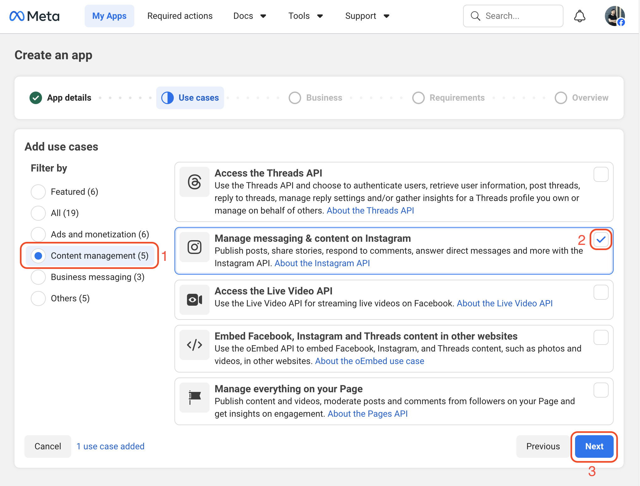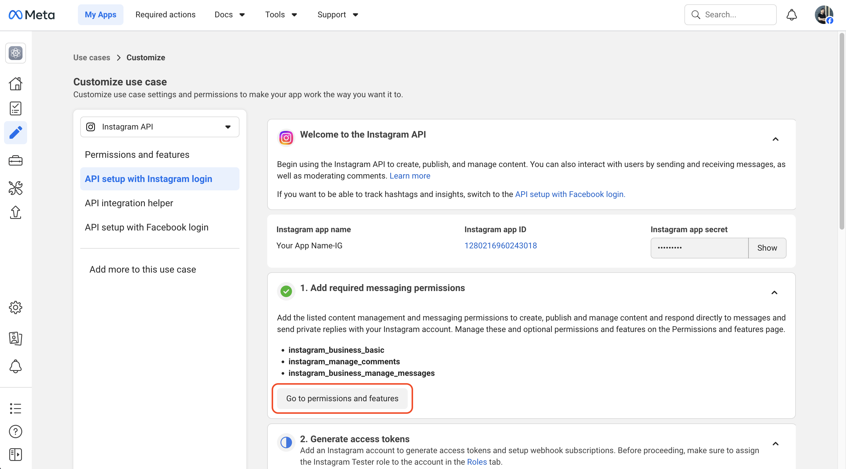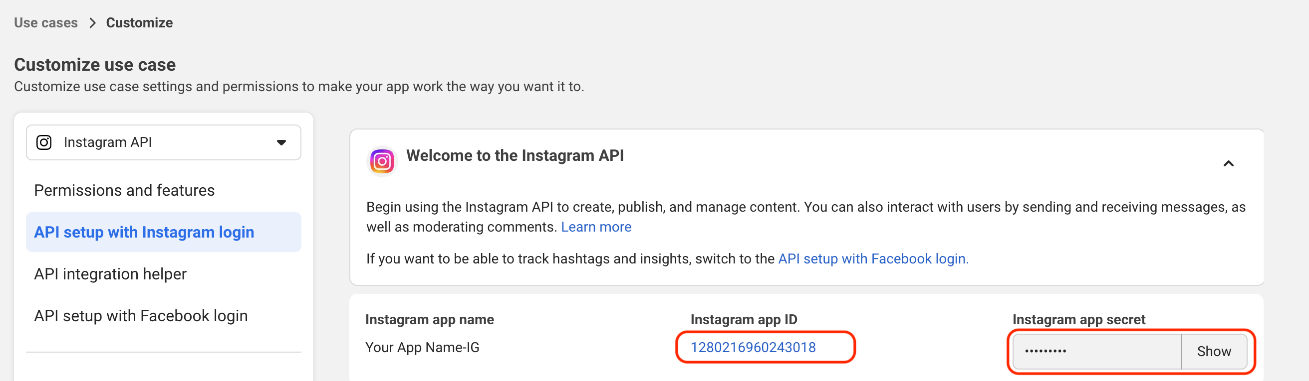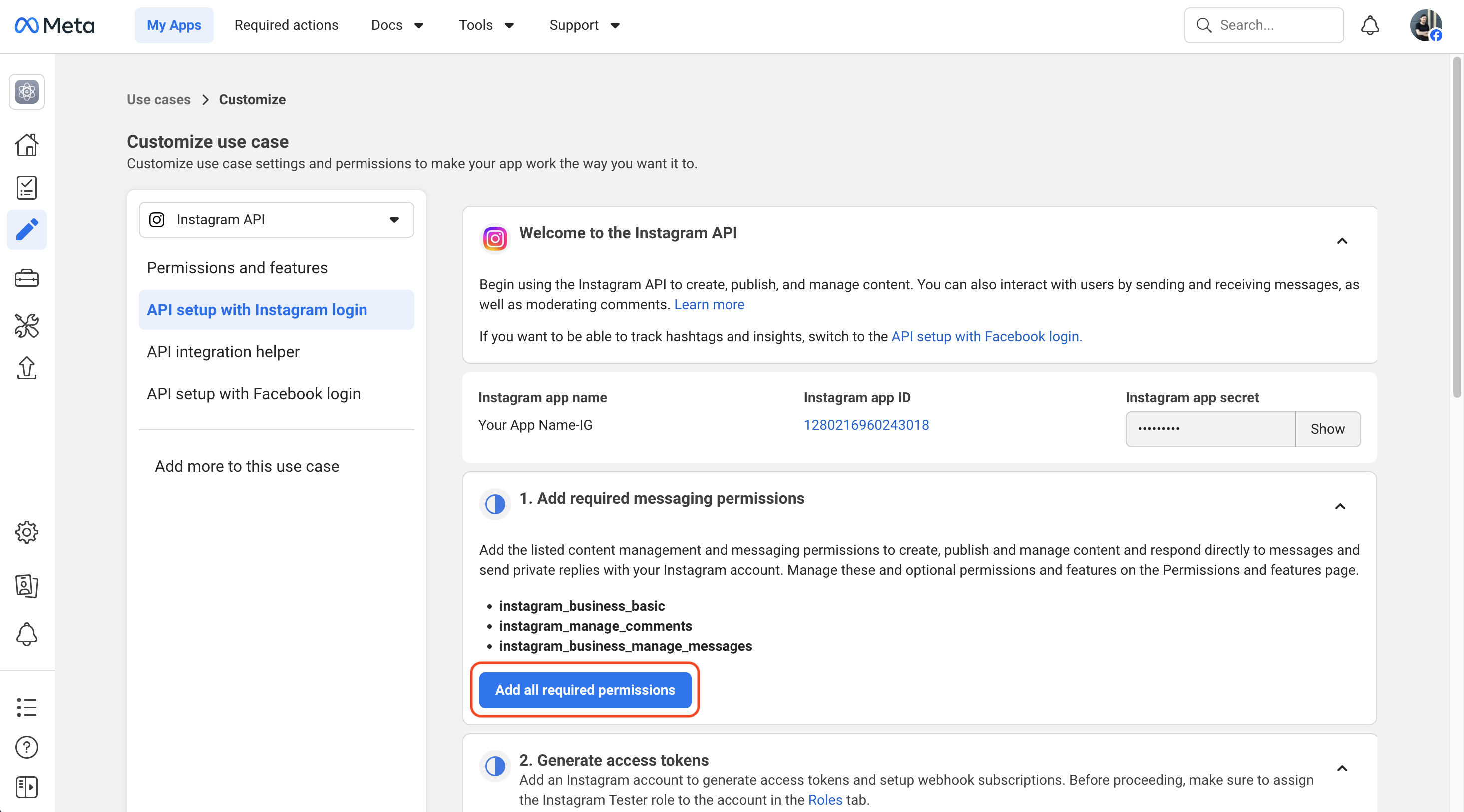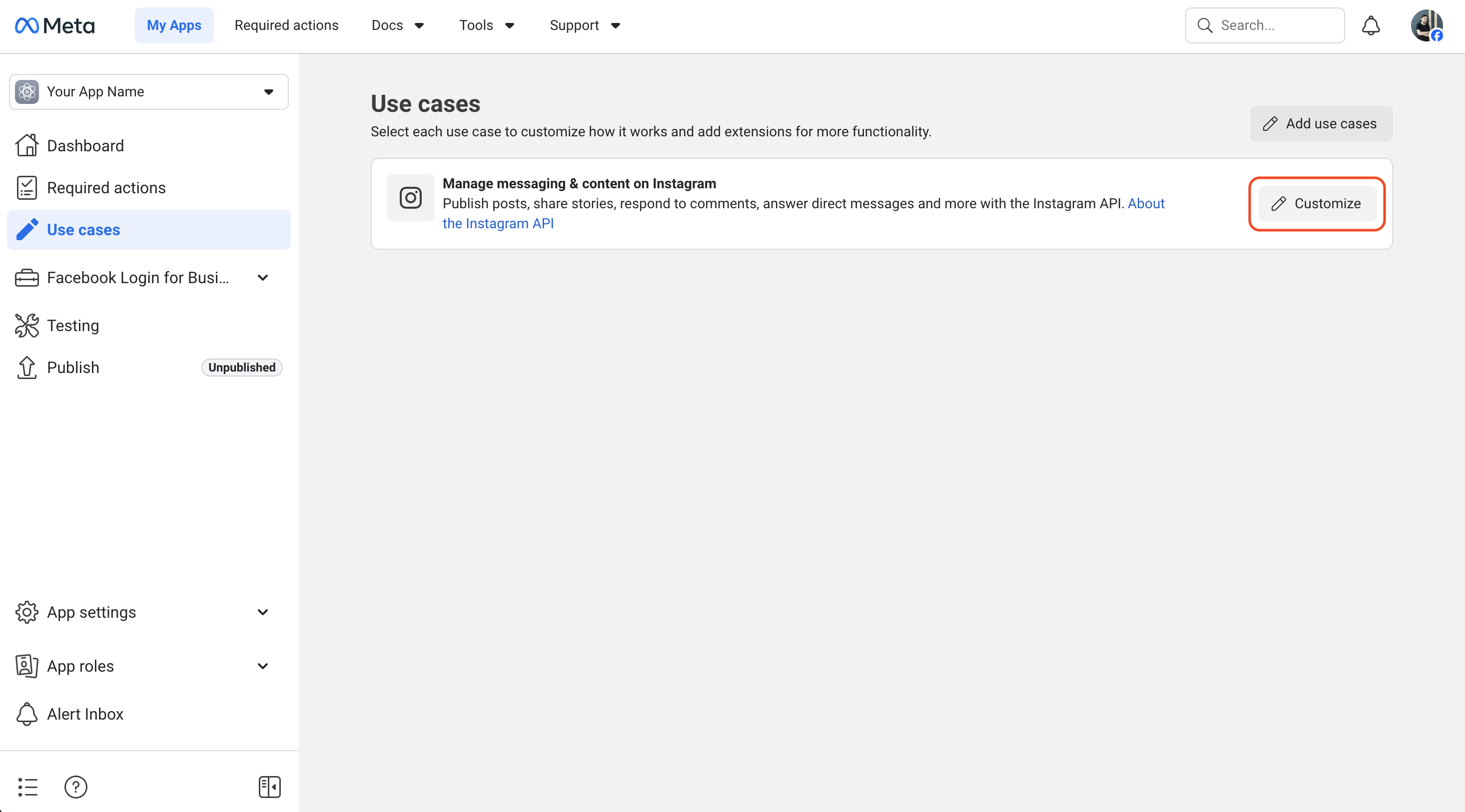 - From the sidebar, click on Use Cases, locate Manage messaging & content on Instagram, and click the Customize button.