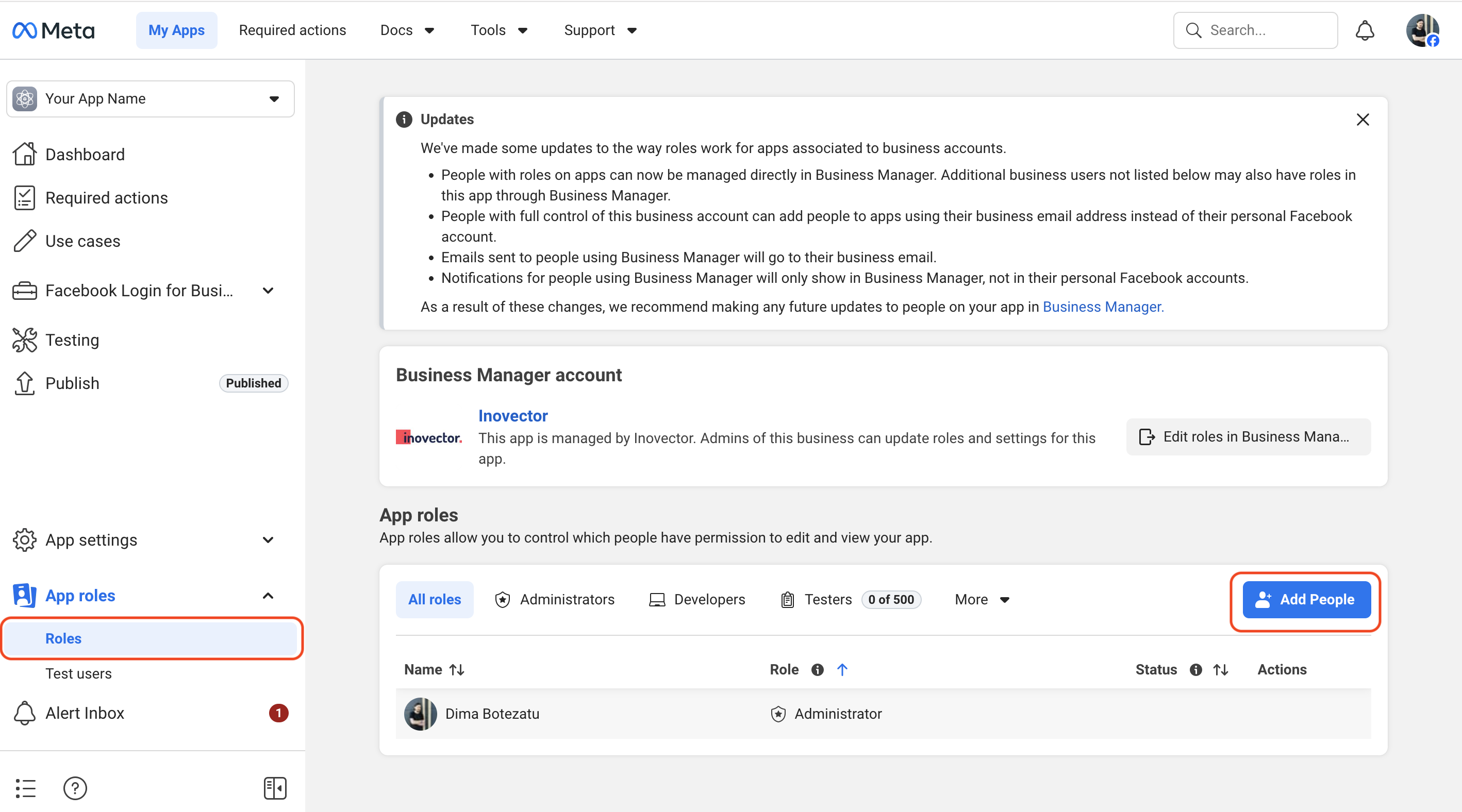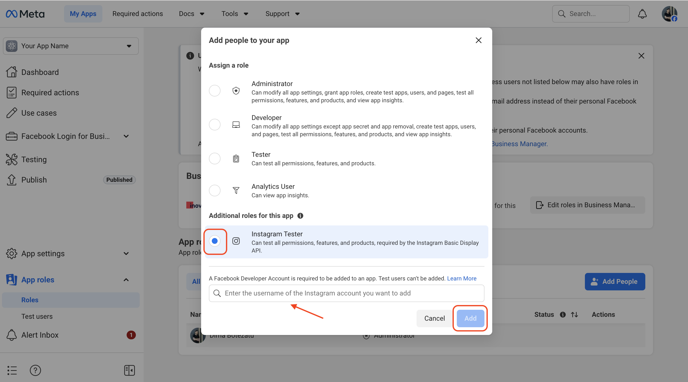 Before the app is published, only users added as Instagram testers can connect their accounts.