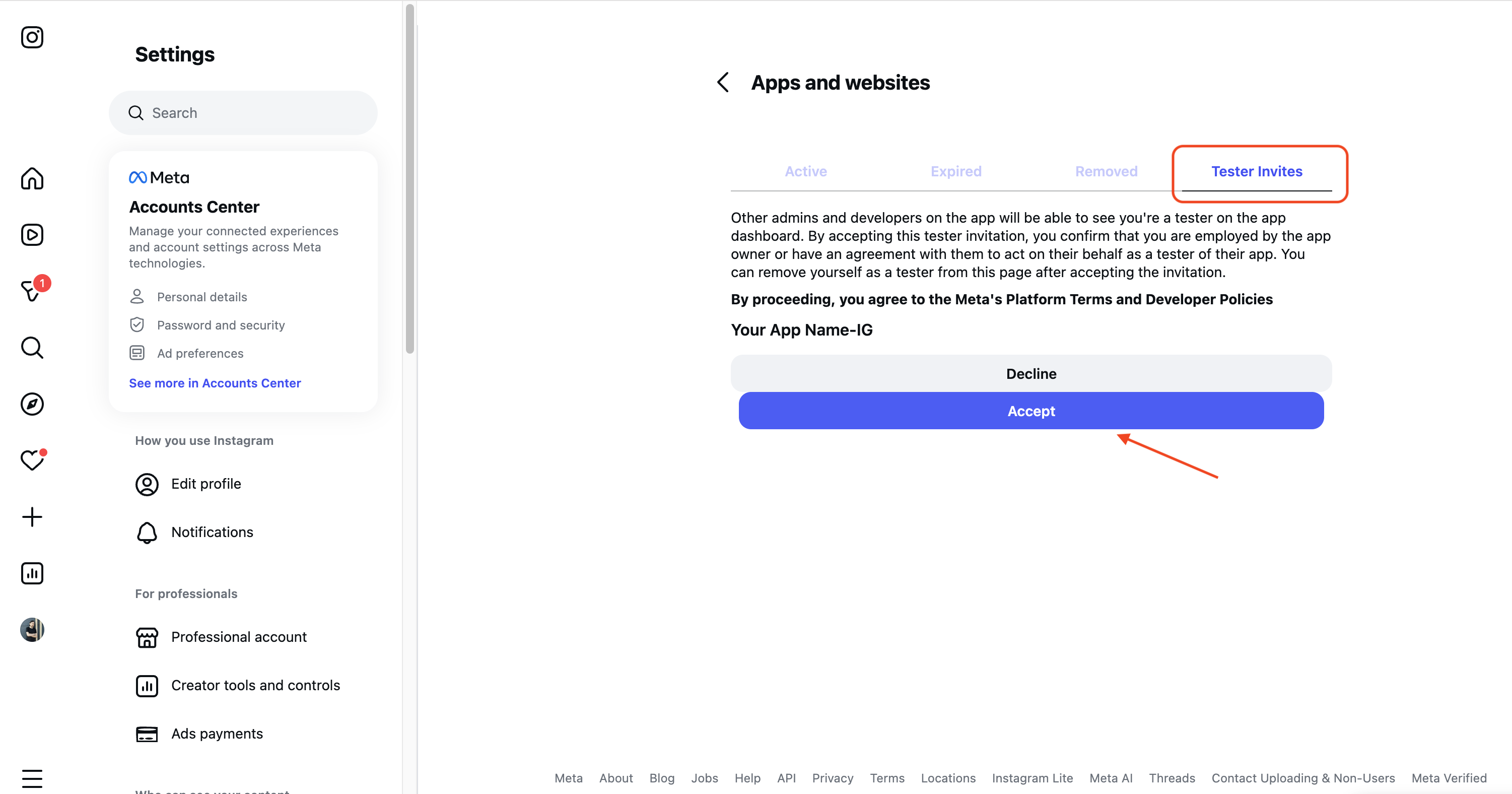 Until your app is published, only Instagram accounts added as testers can connect. To allow any Instagram Professional account to connect, you must submit your app for Meta review and publish it.