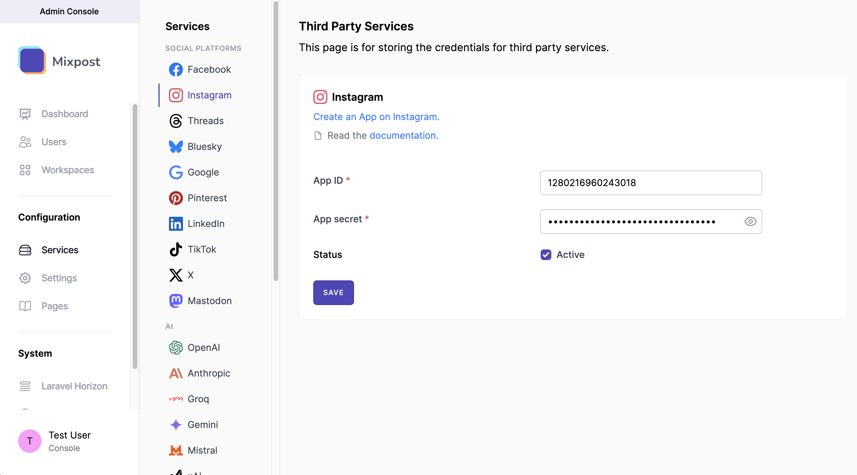 On the same page, scroll to the Instagram App ID and Instagram App Secret sections and copy the credentials into the corresponding fields of the Instagram form in Mixpost.