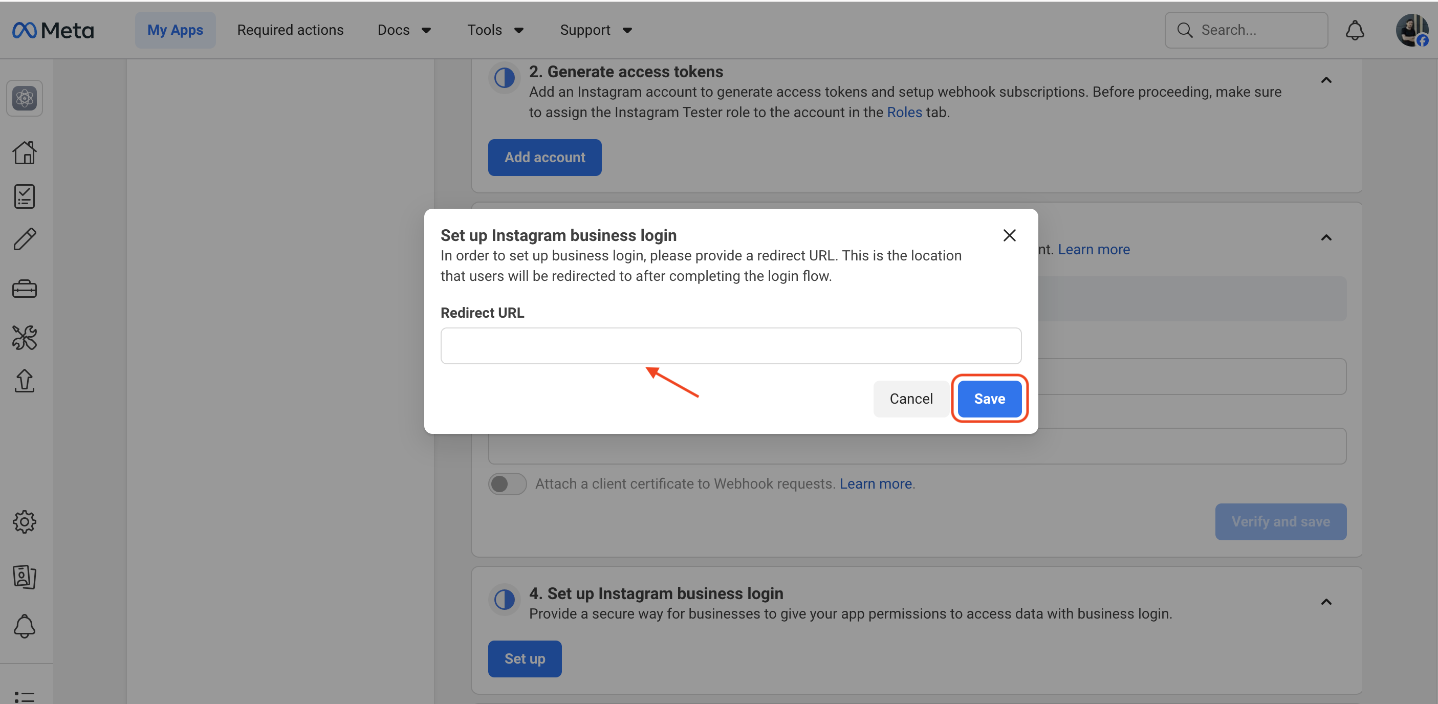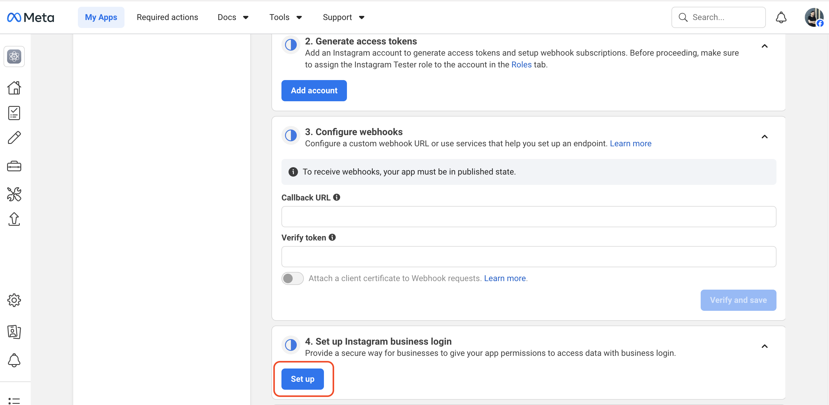 - On the same page, scroll to the Set up Instagram business login section and click the Set up button.